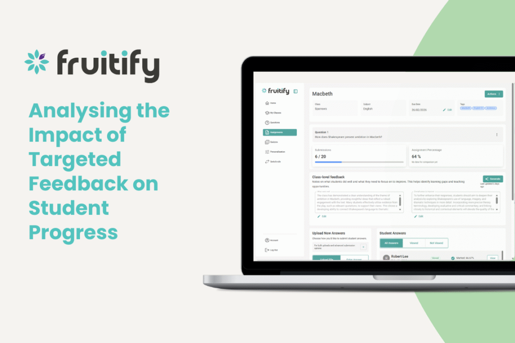 We took a deep dive into five weeks of data from one school using Fruitify, an AI-supported assessment system designed to provide task-linked feedback on extended written responses, and the results are crystal clear: when teachers gave structured, timely feedback using Fruitify, student performance really took off and stayed high! Key outcomes: 📈 14.2 percentage point increase in attainment within one week 📊 15% total improvement over five weeks 📉 22% reduction in attainment gap (standard deviation) ✅ Statistically significant impact (p = 0.0087) 🔁 Sustained improvement across new topics — not a short-term spike The difference was simple but powerful: pupils received actionable feedback much faster using Fruitify than they would usually. The result was not just higher averages but greater consistency across the class. The Starting Point To get a good starting marker, pupils answers were loaded into Fruitify for two weeks, in which they averaged 45.2 % and 41.8 % in Week 1 and Week 2 respectively, with a notable and wide attainment spread between top and bottom performing students. The Intervention: Shortening The Feedback Loop Between Week 2 and Week 3, the teacher introduced timely, actionable feedback through Fruitify. Instead of: A mark/score days or a week later General comments Moving on to the next topic Pupils received: Timely, actionable feedback on what went well A personalised evaluation that is structured, and linked to Assessment Objectives Clear next steps for improvement Feedback stopped being retrospective and became enlightening. The Impact: In One Week The class then repeated the same assessment, and one week later: Class average rose from 41.8% to 56.0% A 14.2 percentage point increase Statistical significance confirmed (p = 0.0087) In practical terms, the improvement was highly unlikely to be random. The feedback changed outcomes. The Strategic Finding: Closing The Gap & Raising The Bar For All What matters for Trust leaders is not just uplift; it’s sustainability, and ongoing improvement. Over Weeks 4 and 5, as pupils moved onto new content: The class average climbed further to 60.2% A 15% total increase across five weeks The attainment gap narrowed by 22% This wasn’t a short-term spike. Or a case of practice makes perfect on one assignment/ question when repeated. The feedback intervention actually created a new, higher baseline of performance. Lower-attaining pupils made the strongest gains, which demonstrates how fast, actionable feedback can help level the playing field for SEND pupils, who are often held back by working memory and anxiety issues. Why This Matters at Trust Level For teachers, schools and leaders with Multi-Academy Trusts, three strategic implications stand out: Feedback timing directly affects attainment: When students receive and act on feedback immediately, understanding stabilises before misconceptions embed. It reduces variability, not just raises averages: Closing gaps improves predictability of outcomes – critical for trust-wide performance oversight. It improves impact without increasing marking burden: Using Fruitify did not require additional teacher hours, on the contrary, it reduced marking burden and delivered smarter, more timely feedback. The Big Question If one class can increase attainment by 15% over five weeks by shortening and improving the feedback loop, the question becomes what this might look like for a whole school or Trust. In this trial, reassessment was made feasible within the same learning cycle without requiring additional marking time — allowing pupils to act on feedback before moving on to new content. As the class progressed to subsequent topics, the improvement in performance was sustained, suggesting that acting on feedback immediately may support a more stable understanding of assessment objectives across future work. Applied consistently across subjects, this approach may offer a pathway towards Trust-wide improvements in attainment.