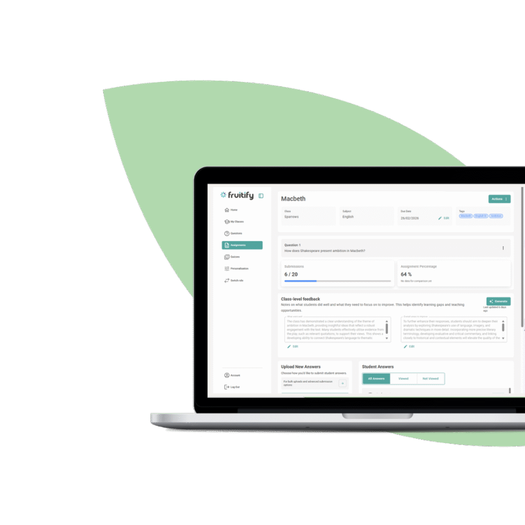 Fruitify adapts to different settings, from individual classrooms to trust-wide use, supporting consistent assessment and feedback at scale.