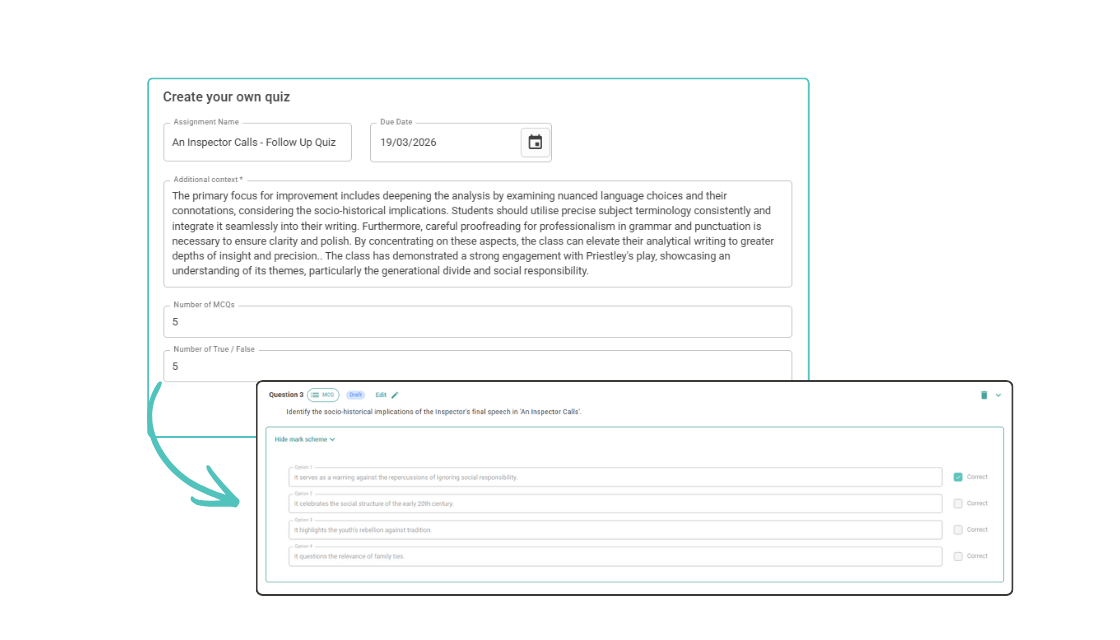 Automatically generate powerful, low-stakes follow-up quizzes based on prior learning. Designed to reinforce knowledge, correct misconceptions fast, and close gaps in understanding.