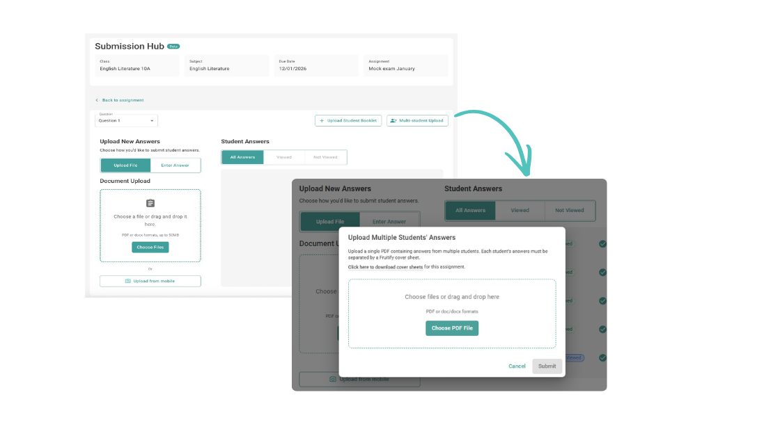 Big class? 250 mocks to mark by Monday? We’ve got that sorted. Upload hundreds of answers in one go and let Fruitify assign to the correct student, transcribe the answer, mark, and provide actionable feedback all in one go!